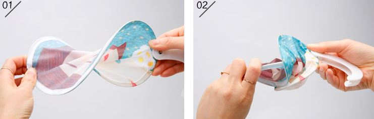 부채 양끝을 잡고 반대방향으로 비틀어 리보노양을 만들고 그대로 틀어 모양을 잡아주세요